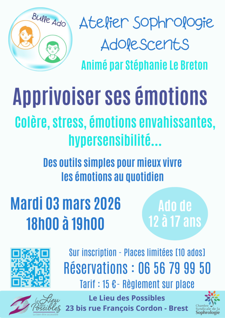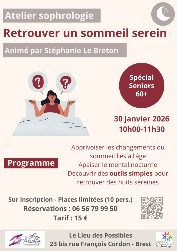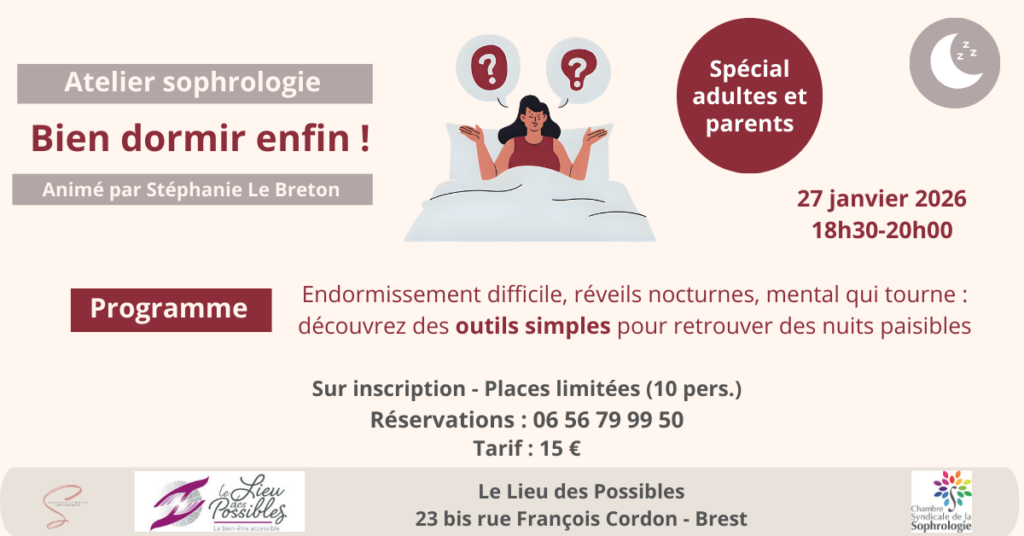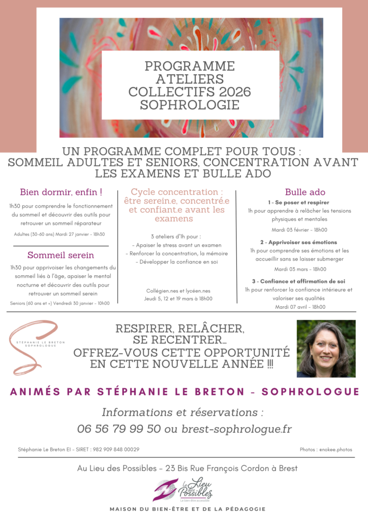 Je propose des ateliers de sophrologie adaptés à vos besoins, en présentiel ou en visio, à Brest et dans sa région.